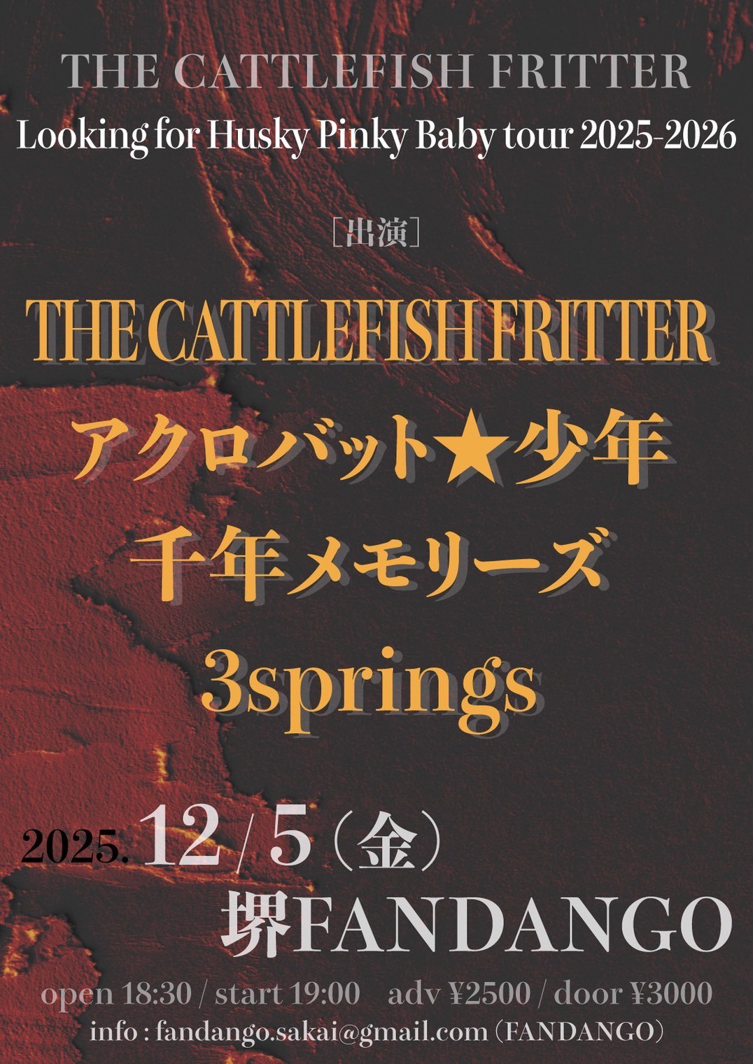 【大阪】堺FANDANGO 堺区戎島町5-3 堺市 大阪府 Japan『THE CATTLEFISH FRITTER 「Looking for Husky Pinky Baby tour 2025-2026」』 Open / Start 18:30 / 19:00 Ticket 前売¥2,...